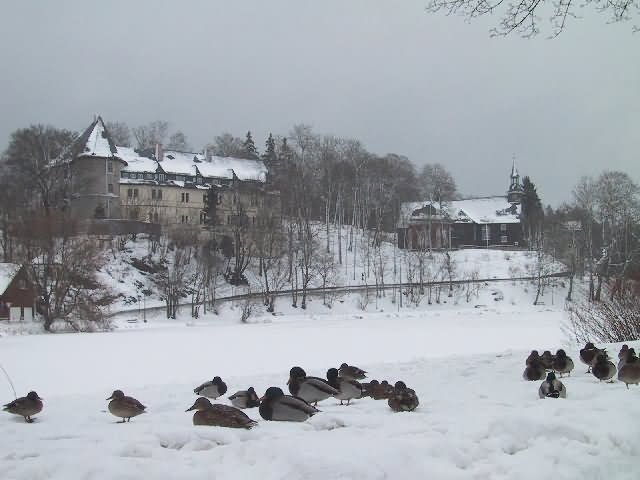 Stiege: Blick über den See auf Schloß und Kirche